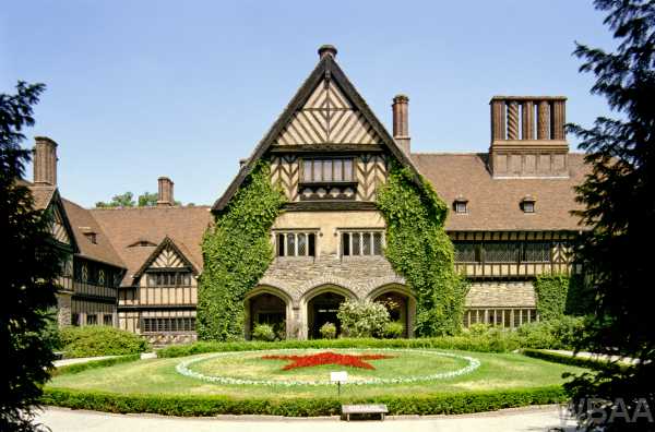 englischer Landhausstil, Fachwerk, Vierflügelanlage, Mittelrisalit, Historismus (Neo-Gotik), Backstein |